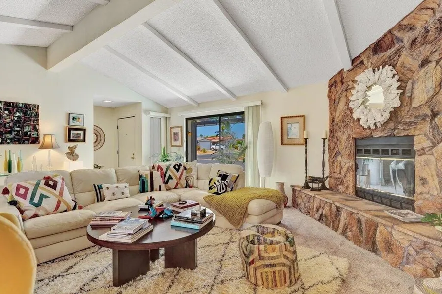 RARE CORNER LOT in Portola Country Club - YOU OWN THE LAND! Located in the desirable gated, active adult community of Portola Country Club (55+), this spacious 1,931 sq ft 3-BEDROOM + DEN, 2-Bath home offers a bright open layout, rare corner lot privacy, and outstanding community amenities. Ownership includes GOLF PRIVILEDGES FOR TWO and a LOW HOA fee covering Spectrum internet, access to the newly remodeled clubhouse, pools/spas, tennis, pickleball, fitness center, Pub, and more. The inviting open floor plan features a striking floor-to-ceiling stone fireplace at the living room, a dining area with a built-in china cabinet, a well-appointed kitchen and TWO COVERED PATIOS perfect for indoor-outdoor living. The primary suite boasts a WALK-IN CLOSET, dual vanities, soaking tub, separate shower, and private toilet room. The den-with SKYLIGHT-is ideal for an office or hobby space. Additional highlights include a TWO-CAR GARAGE with a picture-window view of the mountains and plenty of natural light, a covered carport for extra parking, a spacious laundry room with washer/dryer included, and plenty of STORAGE SPACE! All this in a friendly, centrally located Palm Desert golf community close to El Paseo, College of the Desert, medical, shopping, dining, and entertainment. Enjoy resort-style living, the views, and the lifestyle! Sold AS-IS!!!