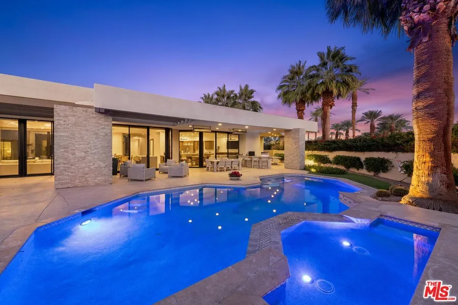 Welcome to paradise! Newly remodeled and just newly furnished custom 5 bed/5.5 bath Contemporary home located in the exclusive The Estancias gated community of only 49 custom properties in prime La Quinta location, close to Old Town, La Quinta Resort & some of the desert's finest world-class golf courses. Situated on a large 28,000+sf lot with private gated driveway, this home exudes the resort lifestyle with incredible indoor/outdoor flow, stunning modern designer finishes throughout and entertainer's backyard. Main home includes 3 bed/3.5 bath with detached 2 bed/2 bath casita (with fireplace, breakfast bar & fridge) located off of the home's inviting center interior courtyard featuring a beautiful spa and tranquil waterfall. Formal entry with powder room opens to spacious living room with entertainers bar & dining table for 10. Large family room opens to breakfast room & open chef's k...