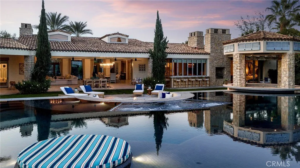 This sprawling contemporary French Country estate with an incredible 250 ft of frontage is located in the only custom home estate enclave of Toscana Country Club, on one of the largest lots and homes in the community ever for sale. The home features panoramic mountain and golf views, including the 18 North and 10 South fairways of the Jack Nicklaus Signature Golf Courses. An impressive stone portico tower with a bronze ship bell off the USS Avery Island leads into a charming courtyard. Just under 10,000 SF, the home is a true entertainer's dream with a dramatic great room with soaring vaulted ceiling, stunning fireplace, hand-hewn old barnwood beams from Pennsylvania, a Chef's Kitchen with a stone accent wall, Wolf and Sub-Zero appliances, wine room and a massive dining table. Disappearing sliders open to the covered veranda that spills out to the resort-style grounds, including a sparkling black bottom infinity pool, stone gazebo bar, sunken fire pit and outdoor kitchen also enclosable with full A/C, all surrounded by lush landscaping. Relax in the spacious master retreat with a dramatic fireplace, pocket glass doors, a marble bathtub and patios. A separate wing is perfect for guests and offers a kitchen, living room, bedroom, en-suite bath and covered veranda. There is a casita with a full kitchen, private entrance and en-suite bath and two guest rooms with en-suite baths, including one that can be converted to a library. The home is equipped with a Savant home automation system and solar panels. This home is a true work of art and is furnished with a world-class designer's touch.