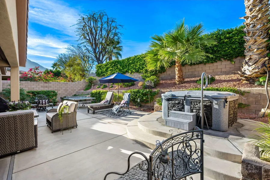 Welcome to the coveted Trilogy La Quinta-an exclusive 55+ resort-style enclave cradled by breathtaking mountain vistas! This highly sought-after Monterey plan, with new aboveground Spa and charming Tuscan facade offers 2 bedrooms, 2 baths, a versatile den/office (easily a 3rd bedroom with stylish barn doors), and 1,693 sq ft of open-concept elegance. Bask in the natural light of the great room, featuring custom window treatments, recessed lighting, tile flooring, and a sleek media niche. The entertainer's kitchen dazzles with stainless steel appliances, slab countertops, gas cooktop, double built-in ovens, microwave, a generous prep island with bar seating, and a walk-in pantry. Guests will appreciate the comfort, and privacy afforded them, and the primary suite is a serene escape with plank flooring, a bay window, and spa-like en suite complete with dual vanities, expansive shower, and walk-in closet. Enjoy a full laundry room with deep sink and ample cabinetry. Step outside to your private oasis with covered patio, soothing spa, professional landscaping, retaining wall, and an oversized concrete deck ready for gatherings under the stars. Just a quick 5-minute golf cart cruise to the Santa Rosa Clubhouse and all the resort amenities it offers-this home is desert living at its finest!