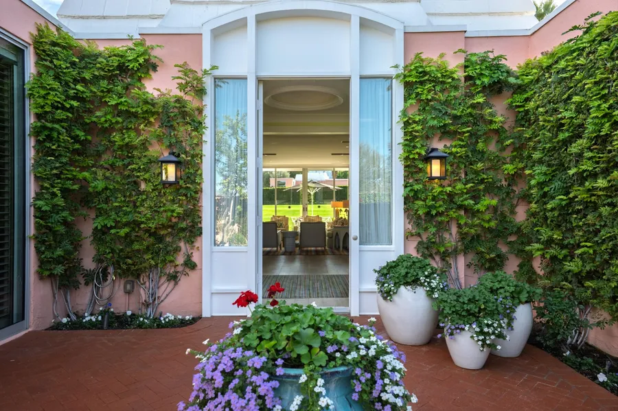 A sophisticated blend of iconic Hollywood Regency architecture and modern luxury, this beautifully reimagined residence is located within the renowned, historically designated Marrakesh Country Club, a celebrated John Elgin Woolf enclave. Designed for effortless desert living, this home offers a refined yet comfortable atmosphere with luxurious upgrades throughout. The interior has been renovated with impeccable attention to detail, featuring wide oakwood flooring, recessed lighting, custom millwork and elegant crown moldings. The open-concept floor plan allows for seamless flow between the living, dining, and kitchen areas - ideal for entertaining or relaxed everyday living. The chef's kitchen is both stylish and functional, appointed with premium Wolf and Miele appliances, custom cabinetry, and a spacious center island. Expansive sliding doors invite natural light and open to a tranquil greenbelt setting with beautiful southern mountain views, enhancing the home's indoor-outdoor lifestyle. Outdoor spaces are perfectly suited for dining, relaxing, and enjoying the serene desert surroundings. The residence offers three generously sized bedrooms, each positioned to provide privacy and comfort. The primary suite serves as a peaceful sanctuary, featuring a spa-inspired bathroom with custom cabinetry and a seamless curbless shower with designer finishes, along with a custom-fitted walk-in closet. Both guest suites feature luxurious en-suite baths and direct access to the front courtyard, with one suite thoughtfully reimagined as an elegant den/TV room. Notable improvements include a newer foam roof (2021), HVAC system (2022), new double-pane sliders in all rooms, updated plumbing and electrical, a water shut-off system, complete back patio tile restoration (2025), newly installed in-ground exterior patio lighting (2025), all new fixtures, and a professionally redesigned front courtyard showcasing climbing vines and decorative planters with flowers. Residents of Marrakesh enjoy an exceptional lifestyle with access to 14 pools and spas, golf, tennis, pickleball, bocce ball, and a beautifully renovated clubhouse with fine dining, a fitness center, and a vibrant social calendar. Just minutes from El Paseo, Palm Desert's premier destination for luxury shopping and dining, this residence presents a rare opportunity to own this exceptional home in one of the desert's most iconic and coveted communities.