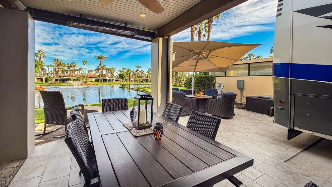 Outdoor Resort Indio is a Class A Motorcoach resort. This is an RV lot. Lot 326 is a highly upgraded RV lot at Outdoor Resort Indio, thoughtfully designed for entertaining, comfort, and privacy-truly an RVers dream oasis. The expansive wrap-around outdoor kitchen and bar features stainless steel appliances including a Bosch dishwasher, built-in microwave, two-burner cooktop, oven, double under-counter refrigerator, wine fridge, and built-in Blaze grill, along with instant hot water, pull-out garbage, custom covers, and abundant storage. The pergola and living area offer tile flooring throughout, a solid-roof pergola with can and pendant lighting, ceiling fans with decorative wood blades, and a TV. Wrap-around electric and manual screens help retain warmth and keep out dust, creating a comfortable outdoor living space. The lot comes furnished with four bar stools, a dining table with six ...