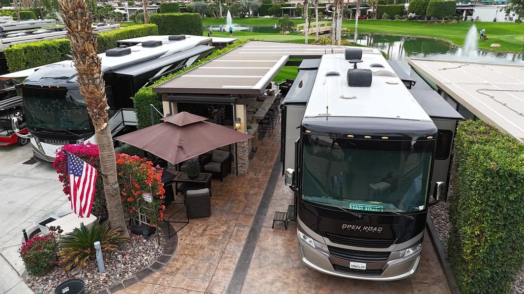 Outdoor Resort Indio is a Class A Motorcoach resort. This is an RV lot. Lot #239 at Outdoor Resort Indio is a thoughtfully designed RV resort lot offering privacy, golf course, lake, and mountain views, along with inviting outdoor living. A five-year-old, well-anchored roof covers a beautiful L-shaped Alumawood pergola with stacked stone pillars, enhanced by abundant recessed lighting and a generous front covered area-perfect for storing chairs and cushions during the rare desert rain. The outdoor kitchen includes granite countertops with a wrap-around bar, all-stainless appliances, a built-in Blaze BBQ and refrigerator, oven, dishwasher, hot water, garbage disposal, and ample storage. A TV on a Televator swivels for ideal viewing, while three electric screens, two ceiling fans, and three ceiling heaters provide year-round comfort. The stamped and sealed concrete RV pad and kitchen area ...