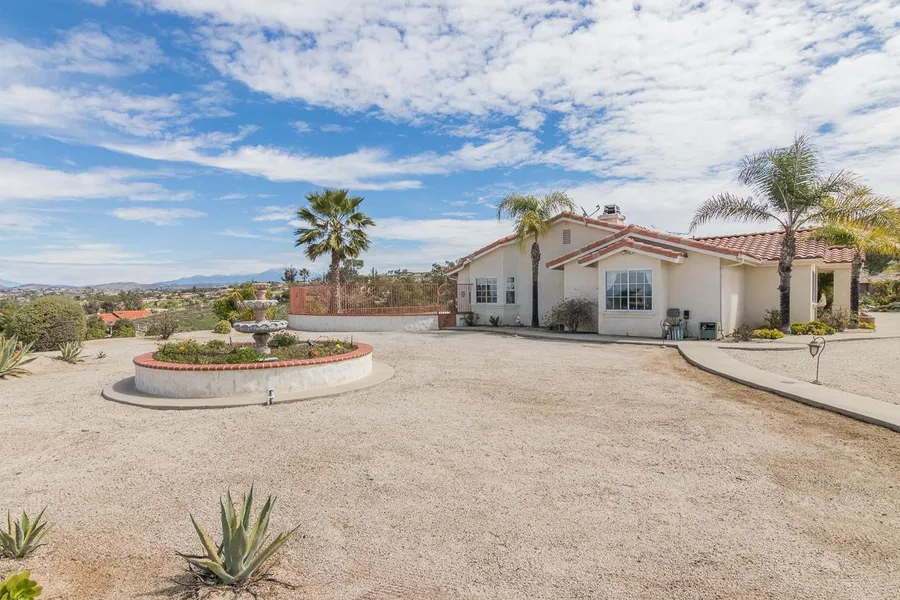 Are you looking for a custom home with a magnificent view in the heart of Wine Country? Enjoy spectacular views of four counties. The beauty of vineyards, groves and mountains from every window offer peace, privacy & tranquility. This single story home has an open floor plan, high ceilings, arched entries, skylights, 16 in. Saltillo tile floors. Kitchen has island, double oven, custom cement counters. Extra large master suite has double walk-in closets, Jacuzzi tub & double sinks. Fireplace in family room. The third bedroom being used as an office is finished with Venetian plaster, doors and windows finished w/ rustic custom wood and gas fireplace. Garden wall in the backyard extended with wrought iron offers an unobstructed view as well as security for pets and children. Large patio, fountains and 12-foot artisan gate make a very inviting but low-maint yard. Enjoy organic citrus, star r...