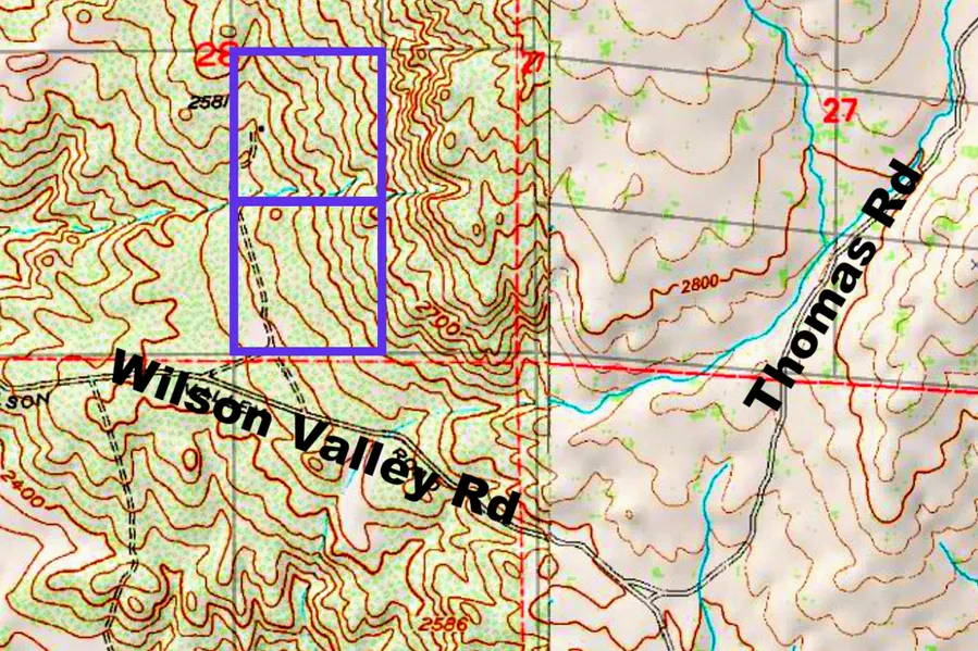 Views in all directions from 80 acres consisting of two 40-acre parcels. Terrain is rolling hills. From the lowest point on the land, parcels slope up gently approximately 160 feet to the highest elevation. Electricity is in the street. Seller says there may be a well on the southern parcel, buyer to verify. The parcels do not touch Wilson Valley Rd and the title company says there is no recorded easement for ingress/egress. This means there is currently no legal access to the land. Buyer can investigate creating an easement after closing, if desired. This is why this large acreage is such a bargain price!