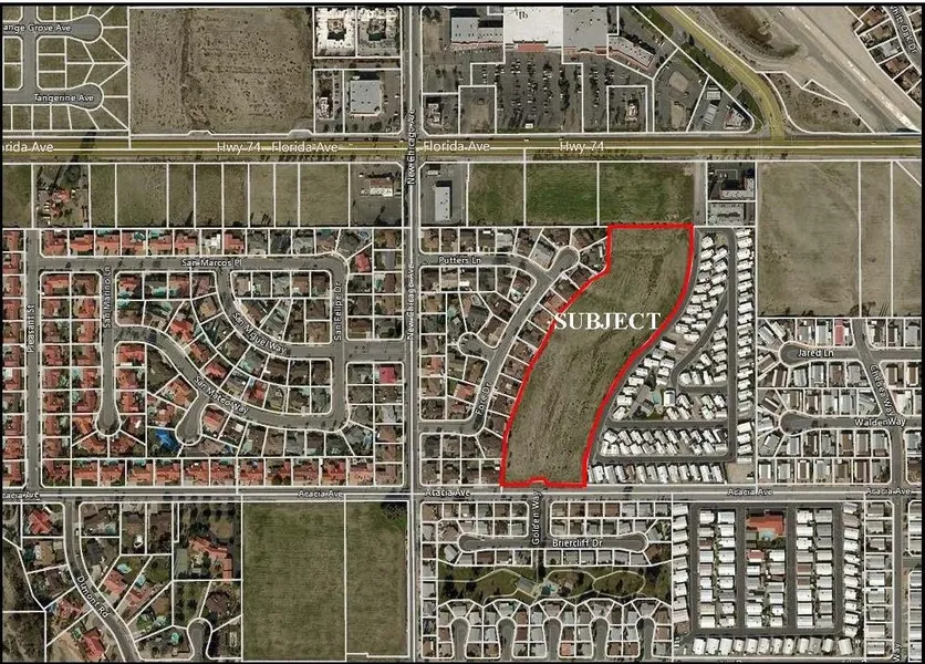 8+/- acres on Acacia Avenue at Golden Way, east of New Chicago Avenue, south of Highway 74 (Florida Avenue) in unincorporated Riverside County. Zoned R-2-4000 - Multi-Family 4,000 minimum SF lot. Site was previously approved for 112 condo units. Nearby retail included The Mountain View Plaza shopping center at Florida Avenue and the Ramona Expressway.