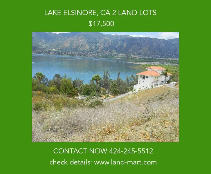 TWO UPSLOPE LAKE VIEW LOTS on prestigious SKYLINE DRIVE, Riverside County. Excellent investment HOLD or BUILD. Per the City of Lake Elsinore, good buildable home size once lots are merged. Manufactured homes allowed. Utilities in paved street. No water available on Skyline Drive currently. However, until available, water available from Sunnyslope Ave.-(the next street above lots). Great location in the hills overlooking the freshwater lake and the magnificent Ortega Mountains. County Club Heights! Minutes to four-corners-Riverside Dr. (Hwy 74), & Lakeshore Dr. This is a major Northeast corner in Lake Elsinore. Close to shopping with the fabulous recently renovated Historic Main Street. Many quaint shops and dining. The parcel is close to Lake Elsinore Outlets, newly constructed commercial shopping, and industrial s...