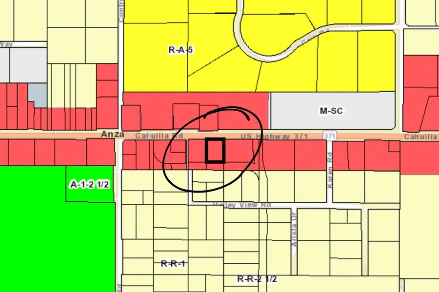 Commercial lot directly on Hwy 371 in Anza. Central location approximately 200 feet from the Circle K. Zoning is C-P-S Scenic Highway Commercial. Size is 0.81 acre and dimensions are approximately 165 ft wide by 212 ft deep. Water and electricity are available. The terrain is flat. Go for a drive and check it out!