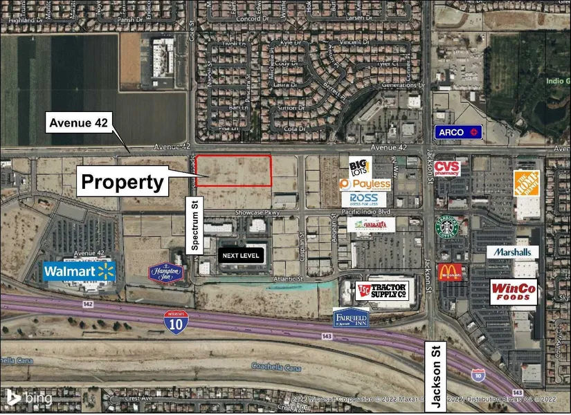 Signalized light industrial corner, in the hottest commercial market in the Coachella Valley. This area is busting at the seams with existing and major retail development. Easy access to Interstate 10 at Jackson Street. Join businesses such as Marshall's, Big Lots, Chase Bank, Starbucks, Ross and Payless Shoes, Walmart, Home Depot, Hampton Inn and Marriot's Fairfield Inn along with other proposed large hotels. Surrounded by many other successful business, stores and restaurants. Water and Sewer are available in the street. THE TRAIN IS STILL IN THE STATION BUT WON'T BE FOR LONG!