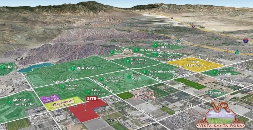 Prime Residential Development Opportunity in neighborhood of exclusive country clubs In an area of many equestrian estates and three miles from the acclaimed Desert International Horse Show Property with breathtaking views of the Santa Rosa Mountains Wonderful open country atmosphere, but close to all conveniences Across from the Palms Golf Club and close proximity to Andalusia Country Club, PGA West, & Madison Club In the sphere of influence of the City of La Quinta
