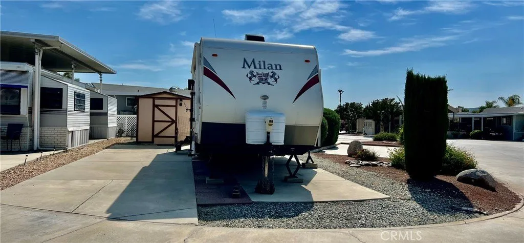 OWN YOUR LAND! Desired Mt shadows RV Resort Gated 55+ Senior Community. Charming 2013 Milan Eclipse Recreational Travel Trailer Included With An Electric Lift Max Capacity Of 300 LBS To The Front Door Entrance. Beautiful Cherrywood Cabinetry, Refrigerator, Microwave, Propane Cook Top & Oven. Master Bedroom Has His & Hers Closets, TV Can Be Watched From The Living Room & Bedroom. Living Room Area Has A Couch & Kitchen Table That Can Be Made Into Beds & Guest Bedroom Has Four Bunk Beds & Extra Storage Cabinets. Bathroom Has A Step In Shower Stall And Access To The Back Door. Storage Shed Has Been Repaired & Painted. Located On A Corner Lot With Great Views Of The Mountains. Extra Guest Parking At The Side & Across The Street From The Property Makes The Location Very Desirable. Two Clubhouses To Choose From & Close Distance To The Main Clubhouse With Many Amenities To Choose From Including Heated Salt Water Pool, Spas, Billiards Room, Shuffle Board, Picnic Area, Gathering Areas, Large Community Kitchens, Exercise Rooms, Rest Rooms & Showers, Laundry Rooms, Horse Shoe Pit, Ping Pong Tables, Corn Hole & More. The Association Has Committees That Plan & Organize Several Activities From Luncheons, Excercise Classes, Special Occasion Dinners, Matinees, Bingo, Karaoke And Much More. Great For Commuting To Temecula Wine Country, Mountains, Beaches & Minutes From Diamond Valley Lake. LOW TAXES & HOA FEES Of Approx $243.65 Includes Water, Sewer, Trash Basic Cable & Internet. Resort Living At It's Finest!
