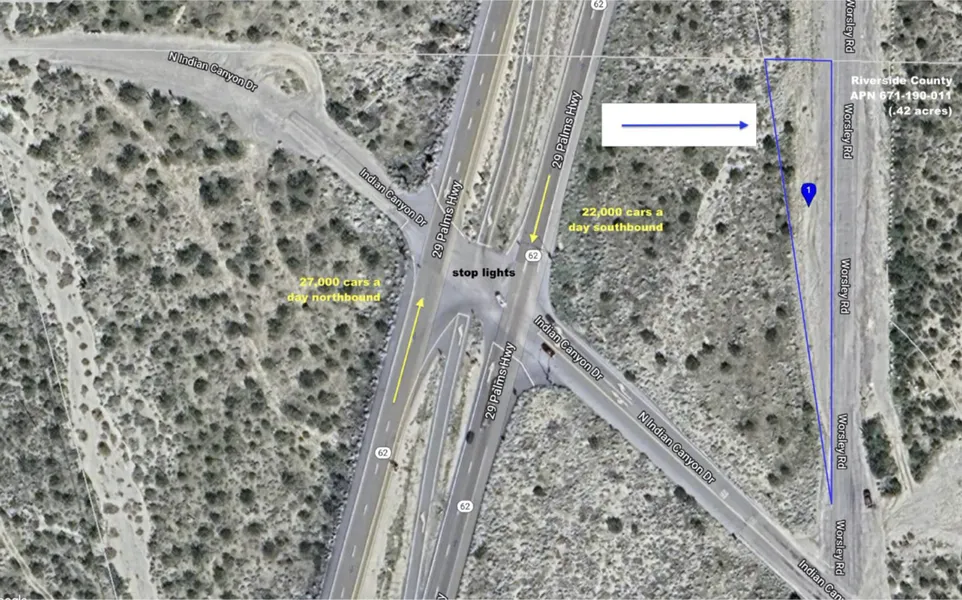 Located just off but visible from highway 62, this property is at the traffic lights where around 27,000 cars a day travel north on highway 62 and many more cars pass by on Indian Canyon. The possibilities are endless for a food truck operation or other uses could take advantage of the thousands of people a day who pass by the property. The uses for the property would need to be investigated and approved by the county of Riverside and a buyer is advised to contact county planning for specific information. This one is a steal at the price. .42 Acres, 18295 square feet.