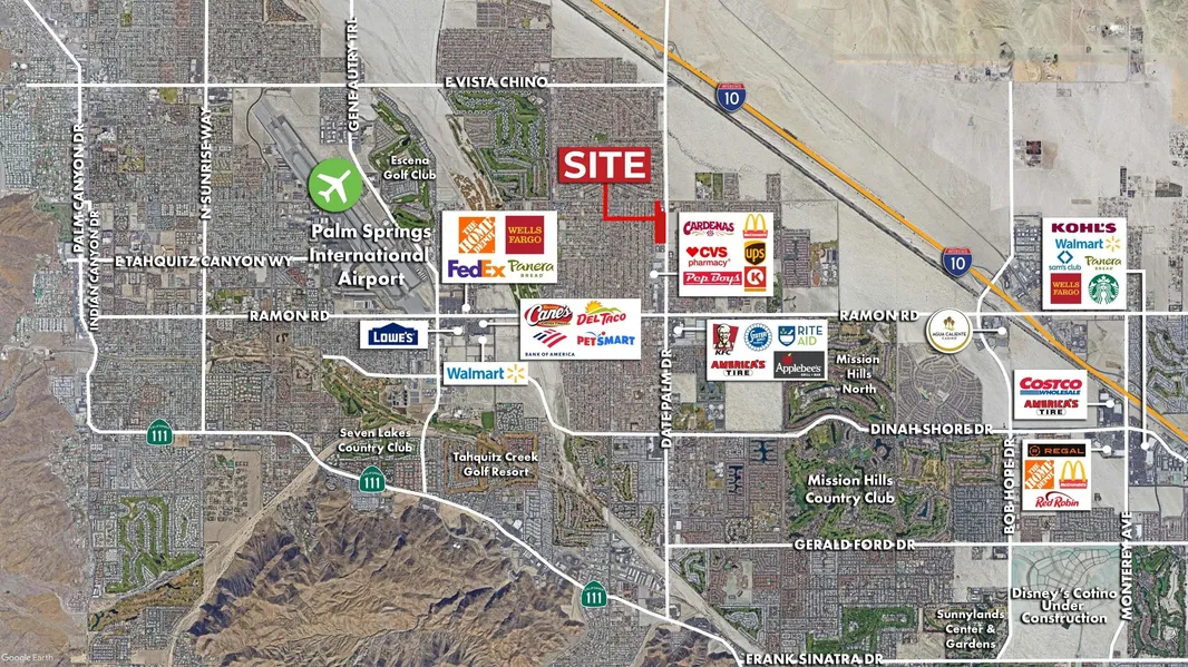 Commercial land with frontage on three road and approx. 1,328 ft. of frontage on Date Palm. Potential grocery store anchor tenant upon development via seller leaseback. Impressive traffic counts of 22,000 cars/day on Date Palm and 14,000 cars/day on 30th Ave. Great location 1 mile south of I-10. Minutes away from Palm Springs Airport, Agua Caliente Resort Casino and Mission Hills Country Club. Cathedral City has the second highest full-time population in the Coachella Valley. Cathedral City has a pro growth and business friendly environment. 100,000 year round west valley residents within 5-mile radius. *Brochure can be downloadable in the 'Document' tab*