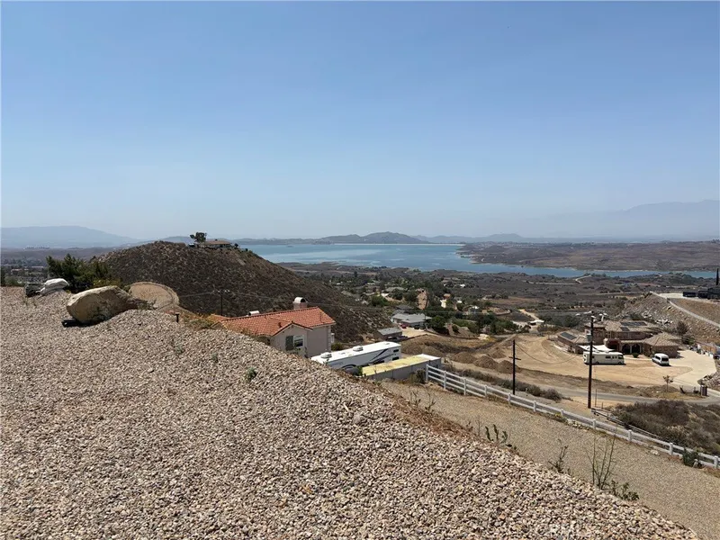 Breathtaking view building lot. Panoramic view of Lake Mathews, mountains and valleys. You can see for miles. The view is approximately 300 degrees of unobstructed view. The lot grading plan and house pad have finalized approval by Riverside County. Water is connected with water meter. Electricity is ready to pull, next to property. The retaining wall is permitted. There is fire truck knockout. At the top of the lot is a metal carport. The lot is completely fenced with wire fencing and white vinyl fencing at front gate entrance.
