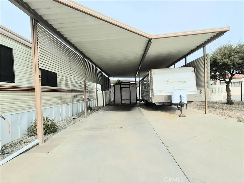 space rent. This is a B lot with a with shed and large carport covering. The exterior showcases partial vinyl fencing and easy-to-maintain hardscape with a lovely citrus tree. Spend more time enjoying the sunsets and the views of Big Bear mountain range from the convenience of this community. This fantastic 55+ community features state of the art amenities including pool, spa, club house, many events for the active lifestyle: Community dinners, dances, and Saturday Breakfast. So much to do in this gated and secure community. HOA $293/month and covers water, sewer,