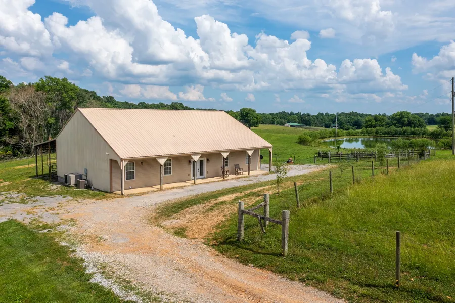 Barndominium with 18.91 acres! This super neat place features a huge, stocked pond; gently rolling pasture land with long road frontage, 814 sq ft of living space, 60x30 shop area, a 24x13 bay and another 24x12 bay, covered areas, fencing and much more. (Office could be used as second bedroom.)