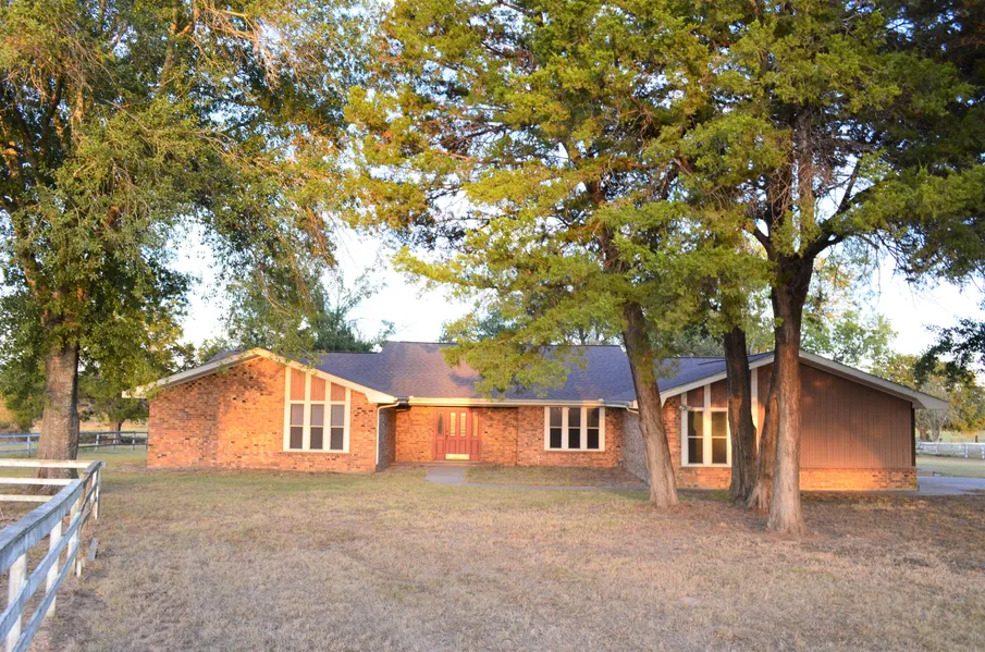 Brick 2612 sq. ft., 3-2 home built in 1981 w new 30yr roof, Carpet, laminate, and tile floors and lots of windows. The kitchen has wood cabinets a breakfast bar, dining area, and office space. The home has a large living room/den w fireplace, raised ceiling. Beside the kitchen is a formal dining room & utility w sink, freezer & pantry. Two-car garage has remote openers. Sit, relax, and view the pasture and Woods on the wood deck along the South & East sides of the home. Land has large trees & Bermuda pasture with wood fence enclosing the yard and driveway. In back is shop with covered parking for one vehicle. RC water meter. All mineral surface rights owned will convey. Franklin ISD