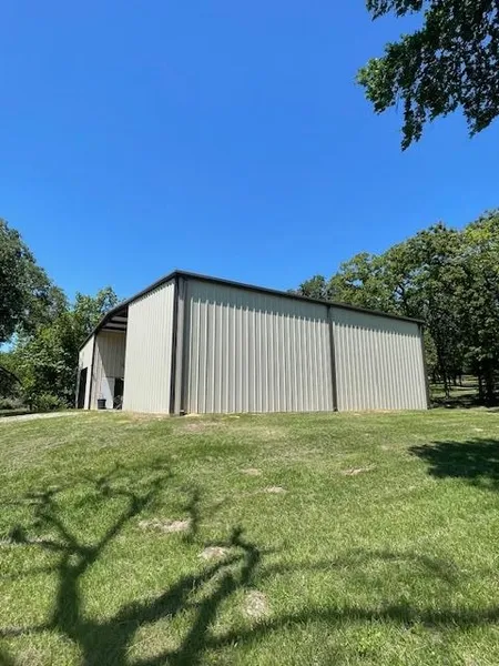 Beautiful oaks throughout this property with multiple building sites. All underbrush has been mulched and removed leaving a park like setting. An all weather road winds up the hill to a 3500 sq ft steel barn on a slab with workshop, kitchen, bathroom, and storage area. Two 200 amp underground electrical service panels. 600'+ deep water well. Propane tank. Tankless water heater. Two propane wall heaters. Quiet, secluded, and 40 minutes from Bryan/College Station.