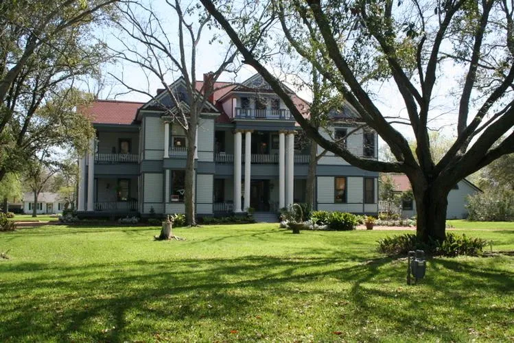 This grand home in its entirety is made of red cypress wood, including the porches. European tiles adorn each of the eight coal-burning fireplaces, while the oak mantles were transported from Waco, Texas. As far as anyone knows, the fireplaces have not been used since around 1910.