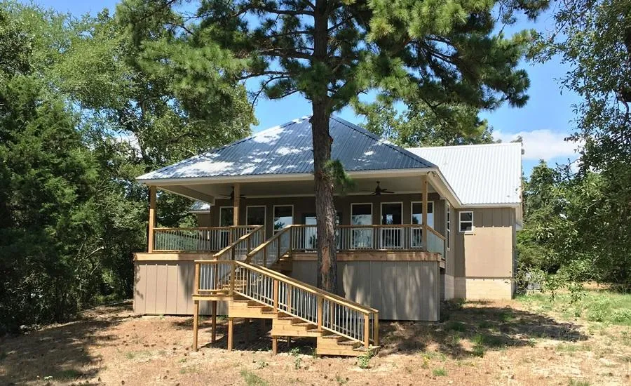 Custom 2003 sq. ft. 4 bed, 2 bath home built in 2016 with 9 ft. ceilings, open kitchen, dining, & living area for an unobstructed view through the 17 ft. by 35ft. porch to the lake. The kitchen has granite counters & island, a gas stove, built in microwave/vent hood, a built in Ice maker, stainless steel refrigerator and natural finish Hickory cabinets. The home features two master suites each with a private full bath, complete with granite counters and tiled showers. Two bunk bed rooms have built in twin bunks and barn style doors. Energy features include, a SEER 16 two stage heat pump, vinyl pane Low E windows, spray foam insulation and a gas fired on-demand water heater that provides endless hot water for you and your guests. Hardie board and batten siding, a metal roof and solid bamboo flooring give low maintenance for years to come. The property also features a 20ft.x 30ft. shop on slab to store your boat or RV and a new 60 ft. fishing pier. Camp Creek Stock Certificate to convey. Franklin ISD