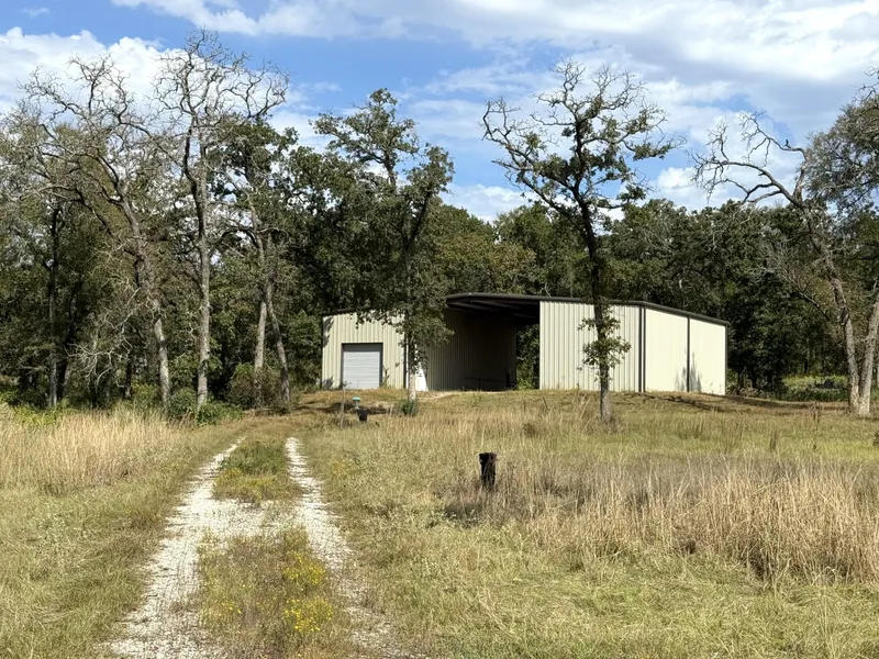 Less than a half mile off paved road is a mostly wooded, rolling, 13.3-acre tract in Franklin ISD at 5878 East Boone Prairie Rd. with 590 ft. of road frontage, a pond and 60 ft. of elevation change. The underbrush has been cleared leaving all the Water Oak, Blackjack oak, Post Oak, Elm, and Hickory trees. This tract has 1,670 ft of graveled driveway leading up to a 2,800 sq. ft. Barndominium divided into a 525 sq. ft. 1 bed 1 bath living area with storage loft, a 21 x 27 enclosed shop with concrete floor & roll-up door, 15 x 50 under-roof concrete RV pad with full hookups, and 35 x 50 area for storage or converting to additional living quarters. The Barndominium has underground Navasota Valley Electric service with (2) 200 AMP meters, a 620 ft. water well (see attached well report), an on-demand gas water heater, and a conventional septic installed in 2016. Property is fenced on two side...