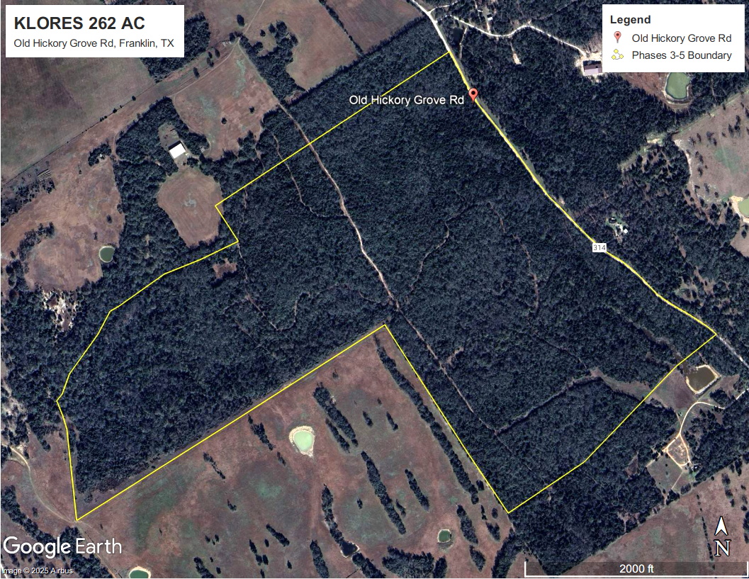 Investors & Developers, if you are looking for Residential development property in Franklin ISD, this property is a must see, or, if you are wanting a recreational property with current Agricultural exemption, this place will check that box. This 262 Acre tract has approximately 3,500 ft. of frontage on Old Hickory Grove Road. It is 95% wooded with Water Oak, Hickory, Elm, Post Oak, Sycamore, Cedar, and Yaupon & has an abundance of wildlife. Rolling elevation changes of 120 ft. provide multiple beautiful homesites. The Sandy loam soils are a plus for road construction, infrastructure, and housing development. Navasota Valley Electric is on-site, and a Robertson County Water main that will service the 68 reserved meters is being installed along the front. The property is under mineral lease with a full surface waiver preventing any Oil & Gas drilling on this property. Seller will convey all surface rights relating to the Oil and Gas Minerals. Property has an Agricultural tax Exemption in place & is Deed restricted. Seller will provide a new boundary line survey. Travel time is ten minutes to Franklin & about 45 minutes from BCS.