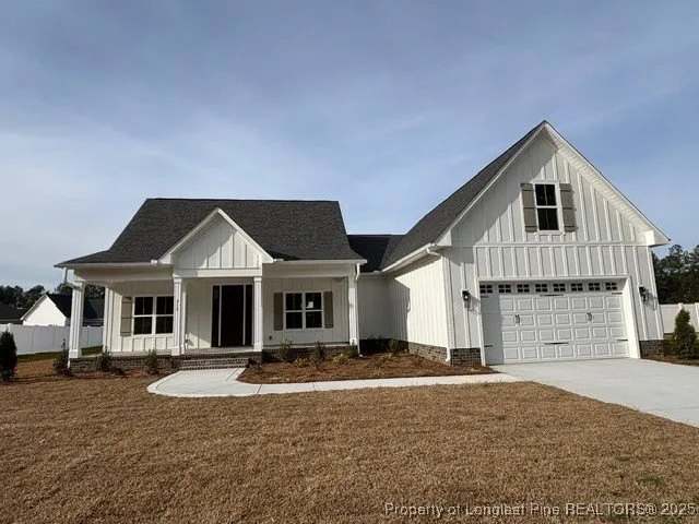 This beautiful new-construction modern farmhouse features fiber cement siding and is located in the desirable Amberdale section of The Oaks community. The home offers 3 spacious bedrooms, 2.5 bathrooms, and a versatile bonus room. This spacious layout includes a master bedroom with an ensuite bathroom with a freestanding tub and shower, and a walk-in closet. Open-concept main floor, where the kitchen, dining, and living areas flow together. Exterior features a double garage, and a covered front porch and back porch. This home is a perfect balance of modern amenities and classic charm. The Amberdale community has a pond and playground near the community entrance. Broker owned.