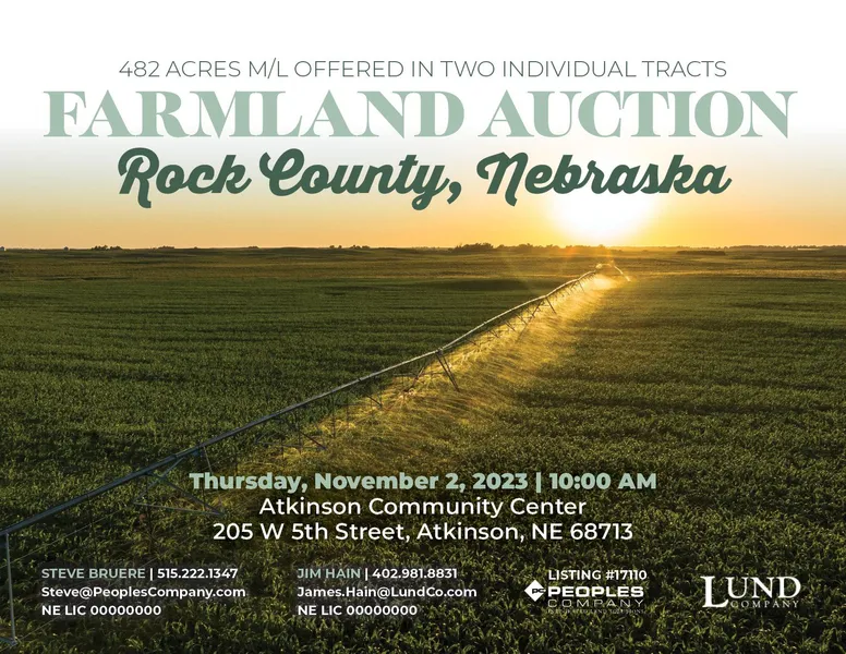 Rock County, Nebraska Farmland Auction - Mark your calendars for November 2nd at 10:00 AM! Peoples Company is proud to be representing the sale of 482 acres m/l near Newport, Nebraska. The farms consist of 395.26 FSA cropland acres with primary soil type consisting of Pivot-Valentine complex and Valentine fine sand. Situated in the Upper Elkhorn Natural Resource District (NRD), these farms consist of approximately 395.28 acres that are irrigated through three well-maintained center pivots. Both tracts are uniquely situated in an area of the NRD where spring static groundwater averages remain steady and there are no current water allocation restrictions.