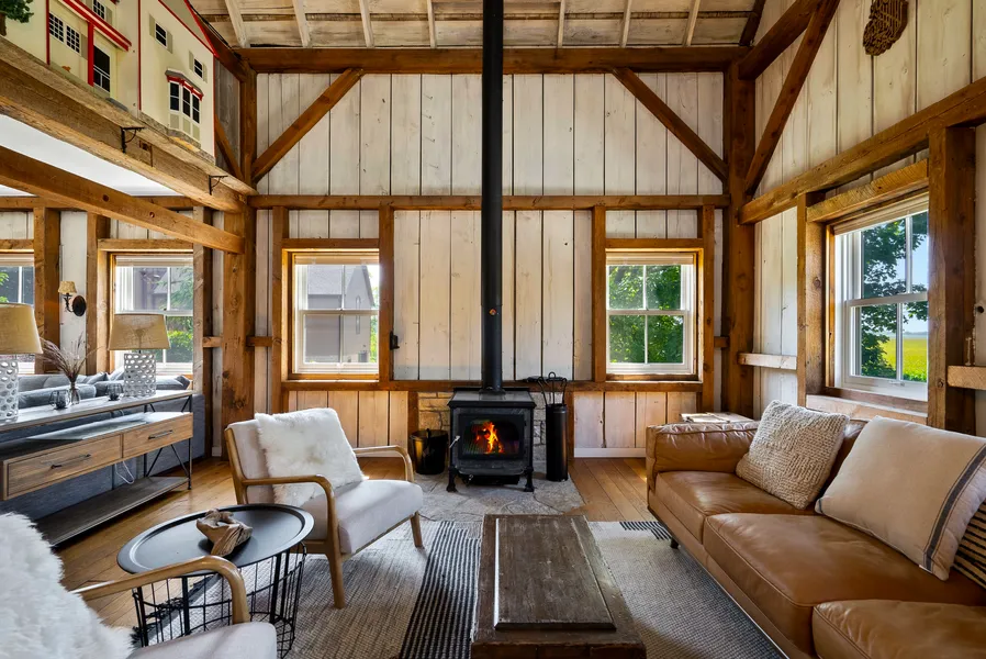 Set on nearly eight vibrant acres with a spring-fed stream, this remarkable converted barn offers year-round enjoyment, blending timeless charm with modern living just 25 minutes from Madison and 2 hours from Chicago. Groomed trails and bridges wind through the property allowing you to enjoy the idyllic landscape. Inside, the home features soaring 32' ceilings, expansive windows that flood the space with natural light and an updated kitchen. The main-floor guest suite, lofted spaces, and walk-out lower level provide distinct areas for versatile living. The charming English barn and attached pole building offer exceptional spaces for entertaining, a workshop, or storage, while the converted milkhouse offers additional potential for creative uses. A truly captivating retreat to enjoy in every season.