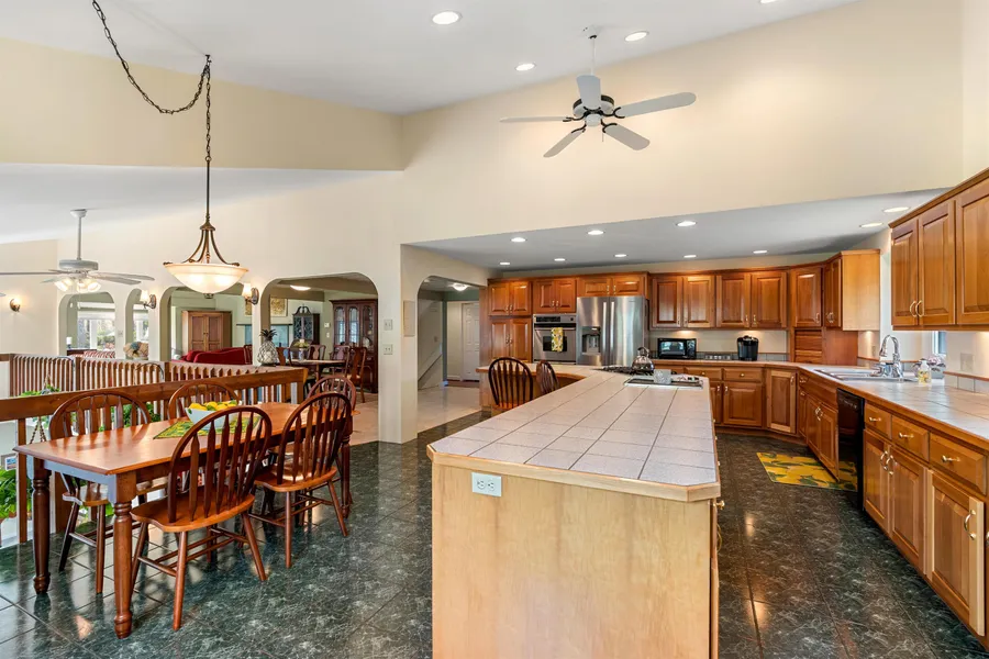 Outstanding contemporary ranch style home located back on a country road with a private setting and beautiful landscaping. This home boasts a high-end eat-in kitchen filled with cherry cabinets, double convection oven, cook-top, grill, a large island, tile countertops, recessed lighting, and vaulted ceiling. The kitchen flows into the dining room and living room and overlooks the great room below. First floor also features a primary bedroom, a full bath, and an office. The sun filled lower level has a media room, a den with a hearth for a future wood-stove, three additional, spacious bedrooms, a full bath, and a large laundry room. Outside of the great room is a new Trex deck covered with a power retractable awning, providing a relaxing spot to enjoy a morning coffee. There is a walk up fully insulated third floor attic for future expansion and a 3 car garage with storage above. Central ...