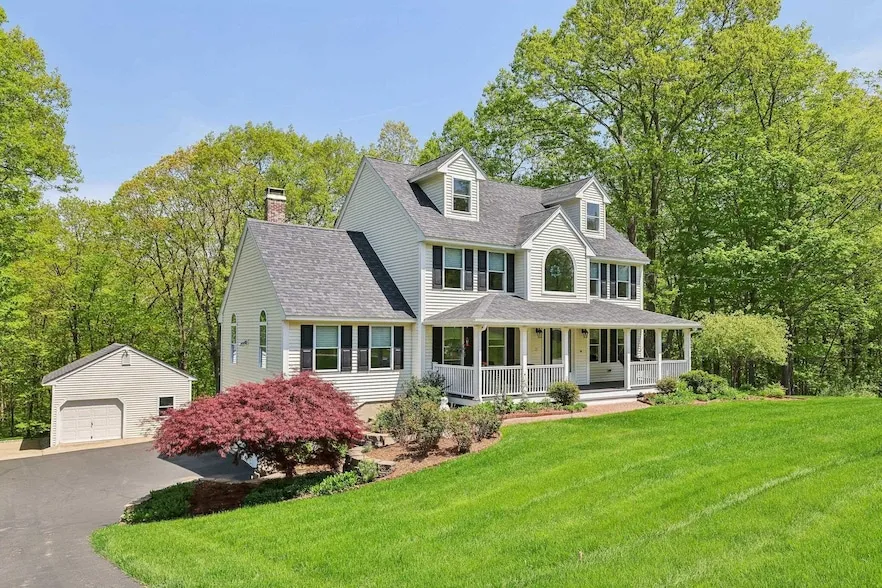 When you visit this property, you won't want to leave! Such a peaceful place to unwind from the everyday hustle and bustle! This 4 bedroom, 2.5 bath colonial sits on over 4 acres abutting CONSERVATION land. Front entry leads to the eat in kitchen with granite counters, tile backsplash and center island. There is a large dining room with hardwood and a bright great room with wood burning fireplace. First floor office or living room and an updated half bath/laundry area. Walk onto the incredible deck and unwind in the sunroom that offers a tranquil place to relax and listen to the wildlife. Second level the the hardwood continues in the primary bedroom with updated 3/4 bath, 2 large bedrooms and an updated full bath. BONUS is the 3rd level with the 4th bedroom and extra spaces to use as you wish. Lower level has a mudroom area, infra red sauna and finished room currently used as the owner's wellness studio. Walk out to the hot tub area under the back deck and continue to the detached 18x20 outbuilding and down the path to the firepit area and garden. LOCATION is perfect in a sought after neighborhood and within walking distance to the middle and high school. You can see how much the owners loved and cared for this special place and hope the new owners will truly appreciate all it has to offer! Showings begin on Saturday 5/17 at the Open House.