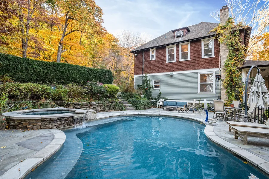 Period details abound including custom leaded-glass pocket doors, thick fieldstone walls, a whimsical turret, cozy fireplaces, window seats, and bricks from the old Nyack hospital used to build the front porch. With 10-foot ceilings and a plethora of windows, you can enjoy spectacular views and an easy indoor/outdoor lifestyle. This 6+ bed, 3.5 bath home offers nearly 5,000 sq ft of living space including a full, walk-up attic and finished basement. The patio and rooftop deck on the western side of the home offer picturesque mountain views of sunsets and starry nights amid curated gardens. The east-facing Juliet balcony allows for breathtaking sunrises. Strategically positioned atop the hill of Rockledge Gardens, the house sits on a dead-end private 1.75-acre lot with no through traffic, offering sublime privacy and a wondrous, peaceful setting abutting Harriman State Park.