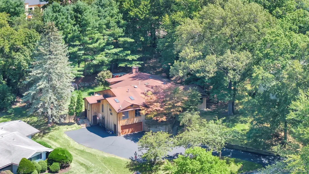 Monsey! Tucked away on a quiet cul-de-sac, this stunning 4292 sq ft mid-century modern ranch blends modern design with timeless warmth. Step into a tumbled marble entryway leading to a ballroom-sized great room with vaulted ceilings, genuine cedar walls, stone fireplace, built-in bookshelves, herringbone oak floors, and dramatic glass walls overlooking lush greenery.