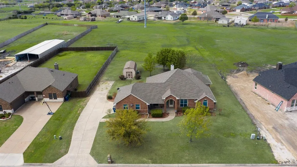 Meticulously maintained by original owners with tasteful updates on quiet .9 acres & NO HOA! Continuous wood flooring throughout the living & dining spaces plus tall ceilings make this home feel bright & airy. Lots of natural light throughout the open floorplan accents the original neutral paint. Kitchen features island plus double pantry for lots of storage. Oversized laundry split from living & bedrooms could easily be set up as a mud room. Generous size living room w tall ceilings & full crown plus art shelf. Bright owners suite w sitting area also has unique wrap around closet for lots of extra storage. Super clean en suite bath checks all the boxes, garden soaking tub, separate shower, dual sinks, seated vanity & private WC. Garage offers extra space for storage & window for natural light. The lot is 112ft in the front & 124ft in the back w sides 306ft & 360ft. Driveway is already extended for extra parking or for your new metal building. Wood building has power & storage loft.