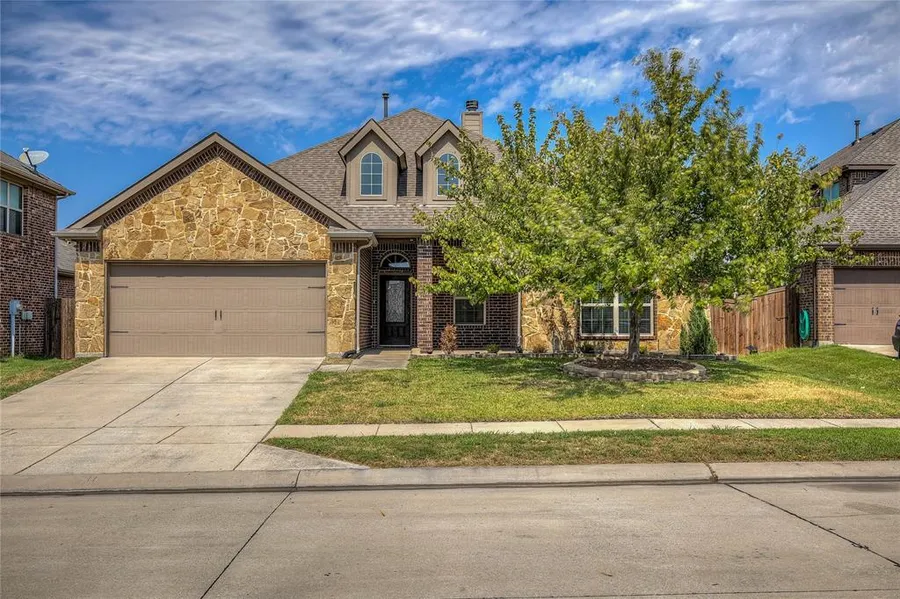 This is the one you've been waiting for... This gorgeous home has 'wow' factor curb appeal with its stone accents, covered porch and dormer windows. Hardwood flooring flows from the foyer to the open-concept common areas. The focal point of the family room is the cast-stone fireplace. The dream kitchen offers an abundance of upgraded soft-close cabinets, convection oven, gas cooktop, oversized island and breakfast nook. The spacious primary suite boasts a tray ceiling with crown and a luxurious bath with dual sinks, granite counter, frameless glass shower with accent tile, linen closet and soaking tub. The secondary bedrooms share a nicely appointed bathroom. The 4th bedroom makes a great home office. Enjoy year-round outdoor living with the enclosed patio (portable AC), pergola covered flagstone patio, extended open concrete patio, dog run and 2 storage sheds. A F5 storm shelter is located in the garage, its narrow footprint doesn't impede parking. The fridge, washer and dryer stay!