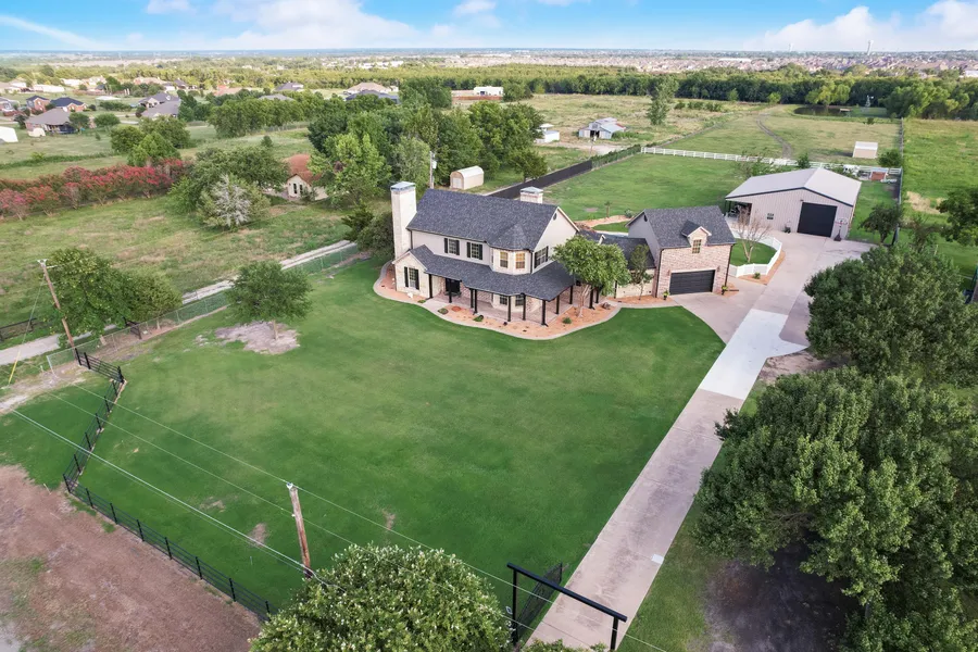 Discover the French Country charm of this wonderful farmhouse situated behind a gated entrance. on approx. 5 acres with a 40X50 workshop, a 2-stall paddock & stocked pond with pier. This impressive home has a gathering kitchen with large prep island, a brick alcove with 6 burner gas stove with double oven & built-in refrigerator. The spacious family room with stained ceiling beam trusses has a brick fireplace with heating insert & a beverage bar that leads to the oversized dining room. A dedicated office with brick & stone fireplace & lots of built-ins offers private access to primary suite with luxury bathroom & 2 separate closets. Additional amenities include swimming pool with rock waterfall, expansive front & back porches, outside living area with fireplace, hot tub, workshop with 3 phase power has an office & bathroom. The property is fenced for privacy & is cross fenced for animals. There is additional parking that accommodates your RV or parking for large gatherings.