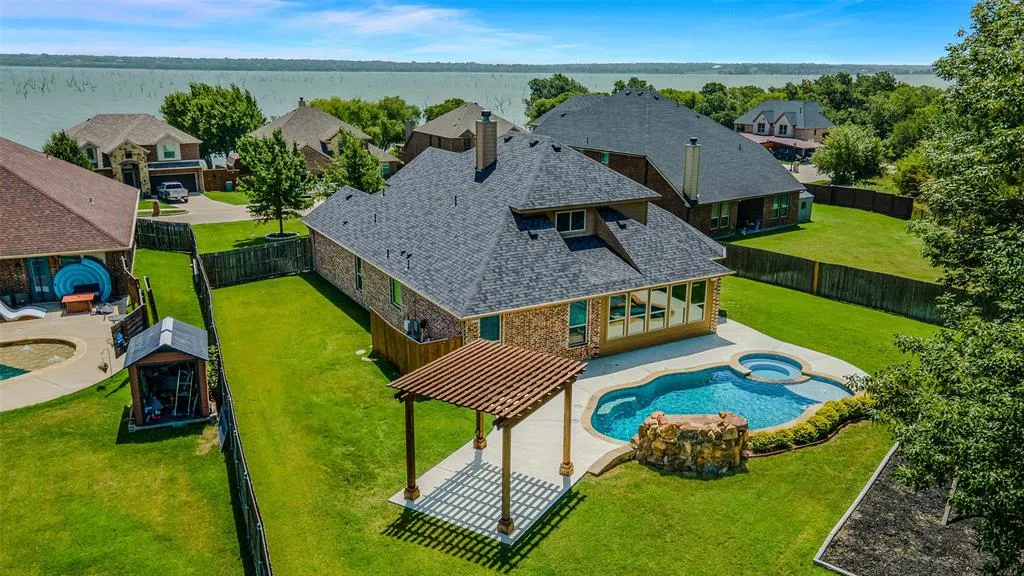 HOUSE WITH IT ALL IN LAKE RAY HUBBARD COMMUNITY! ROCKWALL ISD. Built in 2015 on a half-acre lot, Mainly a one-story 2,723sf 4BR; 3Full Bath; Dedicated Office; spacious Sunroom; Formal Dining and Nook; 2 Car Garage; Much of house is floored with beautiful wood-like Tile. Two-year old pool with sauna and waterfall; raised Pergola with power; Incredible playground with equipment that conveys; and so much more! Property situated on a greenbelt with mature trees that shade the playground. Lake Ray Hubbard is literally across the street. Blue Haven Way is very private with no through traffic. Spacious kitchen with granite, lots of upgraded cabinets, and stainless appliances. Great shopping & restaurants plus great location. Top rated Rockwall Schools and resides County of Rockwall. Run to see this beauty!