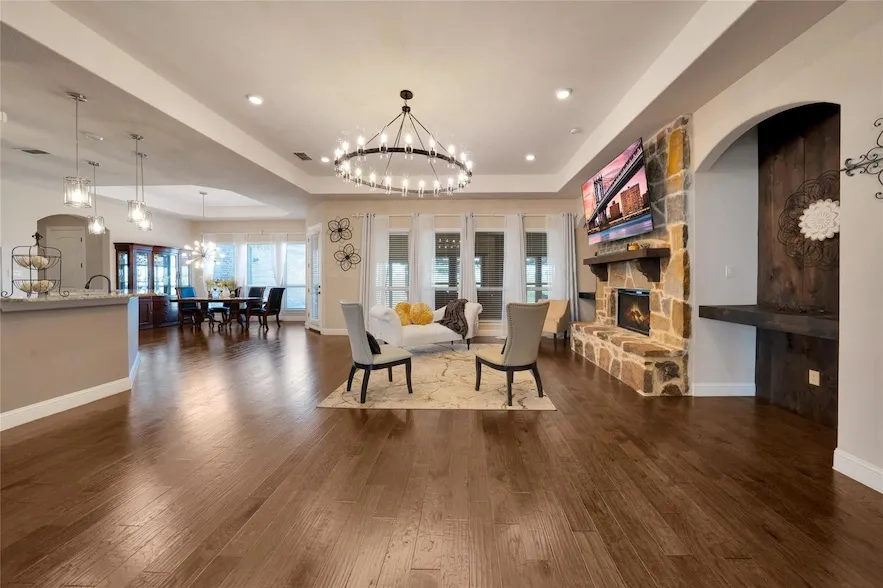 Welcome to your serene oasis near Lake Ray Hubbard! This stunning home sits on one of the largest corner lots in the neighborhood, offering a perfect blend of country charm and modern elegance. The spacious open floor plan boasts a bright living area featuring a beautiful stone fireplace and built-in shelving, ideal for cozy gatherings. Enjoy formal dining, a private office space, and a large gourmet kitchen equipped with a center island, gas cooktop, and high-end appliances, perfect for culinary enthusiasts. Designer lighting throughout enhances the home s sophisticated appeal. The private primary suite provides a luxurious spa-like ensuite and an expansive walk-in closet. Relax in the media room or entertain on the large enclosed back patio, complete with a cozy fireplace and fire pit, perfect for cool evenings under the stars. With gorgeous flooring and ample outdoor space, this property is a rare find. Don t miss out on this perfect blend of comfort, style, and tranquility!