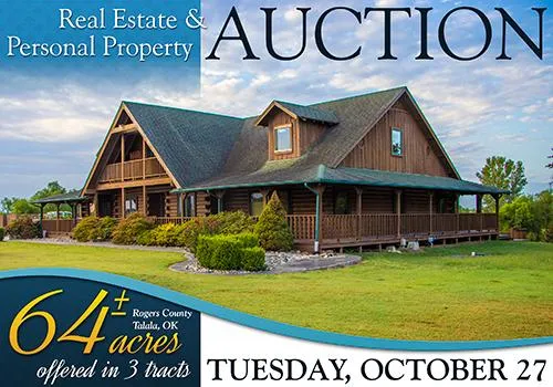 REAL ESTATE BEGINS at 3PM CUSTOM HOME - LAND - HORSE RANCH 64+/- Acres offered in 3 Tracts Custom Built Satterwhite Log Home Morton Built Indoor Riding Arena 10 Stall Barn with More Stall Space Available Morton Built Shop & 2 Pole Barns 3 Ponds Excellent Building Sites Paved Roads PERSONAL PROPERTY TO SELL FOLLOWING REAL ESTATE 2016 Coachman Travel Trailer 1998 Mitsubishi Mini Truck 1967 VW Beetle (Very Clean) Mahindra 1526 HST Tractor (180 Hours) Farm Implements Shop Tools & Equipment Various Trailers Home Decor - More! ONLINE BIDDING AVAILABLE