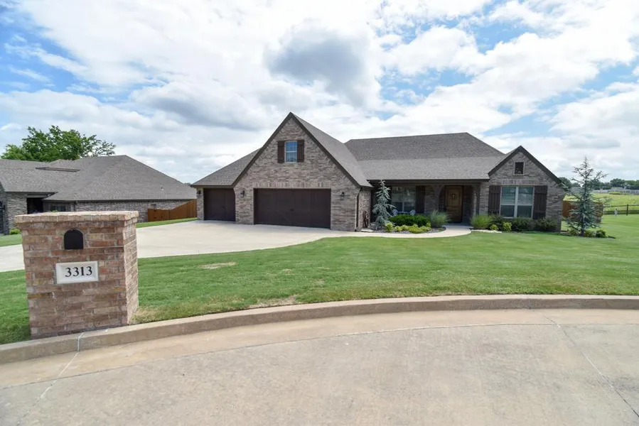 Beautiful home built in 2014 in the Turnberry Edition has a great location adjacent to the Heritage Hills Golf Course and close proximity to Westside Elementary School in Claremore, OK. This 2,159 square foot, 3 bed, 2 bath, 3 car garage home is just immaculate and sits nicely towards the back of the neighborhood in a quiet cul-de-sac overlooking a large field in the backyard. As you enter the home you’ll find 10’+ ceilings with crown molding throughout and all tile floors in the main common areas with carpeted bedrooms. The large spacious living room with gas log fireplace and large open windows overlooks, not only the back yard, but a very peaceful scenic open field. The kitchen is open concept to the living room, perfect for entertaining guests, with granite countertops, large island with bar, custom cabinets with under cabinet lighting, breakfast nook, walk-in pantry, and Frigidaire Professional appliances. There is a bonus room, with privacy doors, adjacent to the living room that is a perfect office/study overlooking the front yard. A large master bedroom with beautiful recessed ceiling sits on the north end of the home. The master bath has double sinks, large bathtub, walk-in shower, and a large walk-in closet. The 2 additional bedrooms sit on the south side of the house and have large closets and share a full bathroom located in the hallway.