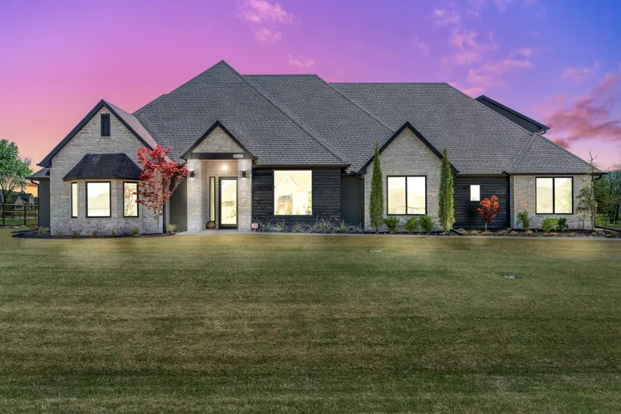 Enjoy the magnificence of this Stone Canyon Estates built in 2020 with handcrafted White Oak hardwood flooring. This house features elevated finishes throughout. Crestron TECH PACKAGE (Home automated Mobile app controlling lights, temp, Home audio, etc.), 2x6 Exterior Walls, Full Home Sprinkler System, 4 - 5 Bedrooms Downstairs, 2 flex rooms up (one could be office or bedroom), 2 Fireplaces, Office & Formal Dining, & 2 Living Areas, HERS Rated 43, Full Home Spray Foam Insulation. Quartz countertops, Shou Sugi Ban exterior with stone and stucco, an outdoor kitchen, and Jeld-wen black energy-efficient windows are among the upgraded finishings. A must-see!!! Neighborhood Pond, Parks, and Trails, Resort style pool and clubhouse, and near Patriot Golf Club. The backyard of this house in Stone Canyon has a lovely view of the outdoors thanks to the nearby trails and treed area.