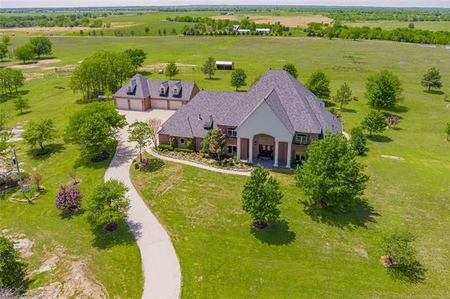 Country Mansion on 24 horse-ready acres 2 min. from beautiful Lake Oologah. Your own private gated luxury retreat. Main house has 5 bds, 4 1/2 bth w/ 2 garages for 8 cars! Living quarters for 6th bed above 2nd detached garage. Designer updates t/o feat. foyer w/ sweeping staircase, formal dining room, 2 offices (1 down & 1 up). 2 beds down both are en suite. Primary suite w/sitting area, huge walk in closet & accesses covered patio & pool. Upstairs gmrm w/wet bar, theater rm, 3 beds all access to balcony.