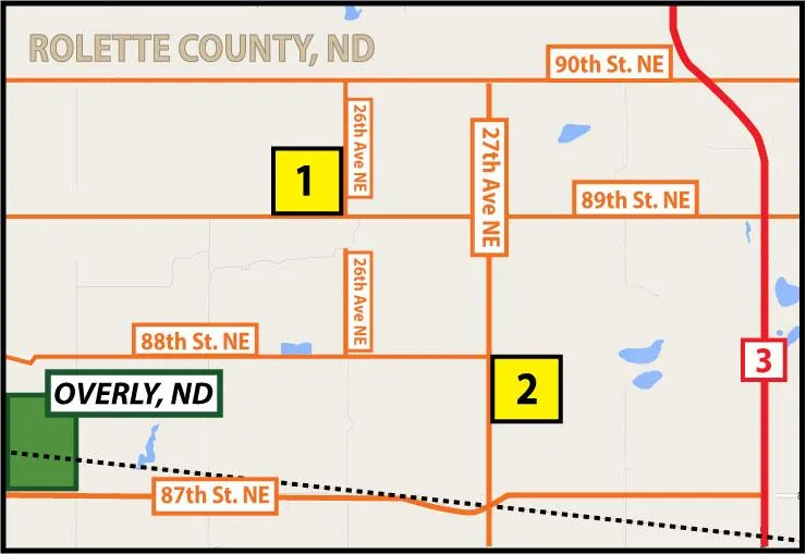 Driving Directions: From Overly go east 3 miles on 87th St. NE to 27th Ave NE. Go north 1 mile on 27th Ave NE. This will bring you to northwest corner of Parcel 2. Continue north 1 mile to 89th St NE. Go west 1 mile on 89th St. NE. This will bring you to the southeast corner of Parcel 1.