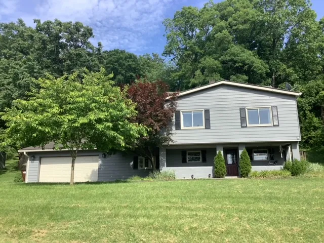 Great location just on the edge of town but over an acre of land bordered by the woods. This is a very spacious home with 3 levels of living space, first floor consists of a large living room, updated full bathroom and kitchen with updated countertops, mosaic backsplash and stainless appliances. Step up to the second floor with a large family room, office nook with skylight and bedroom with large closet and wood floor, second bath with double vanities. Two additional bedrooms on the 3rd level. Two car garage, rear deck, storage shed and a chicken coop. Home is selling As Is.