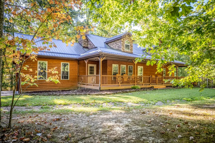 Welcome to this one and a half story home set on a flat lot with mature trees and plenty of outdoor space. The exterior combines wood and vinyl siding with cultured stone accents on the gables and a durable metal roof. A covered front porch runs across the main portion of the house and continues around the side, while a back deck off the dining area creates another spot to enjoy the outdoors. Inside, the entry opens to a spacious great room with tall ceilings, tongue and groove poplar detail, and a combination of hardwood, tile, and carpet flooring. This open area connects the living, dining, and kitchen spaces. Stairs to the right lead to an upper level bedroom with its own full bathroom. The main level includes a full bathroom, two additional bedrooms, a large utility room, and stairs to the basement. The basement is full and unfinished, offering the option to finish for added living space or use as a workshop. An attached garage includes one bay with an added mudroom that connects directly into the great room. With room to expand through future additions such as storage buildings, a detached garage, or even a pool, this property offers space to grow. It is located only 15 to 20 minutes from Cave Run Lake and about 10 minutes from downtown Morehead and Morehead State University.