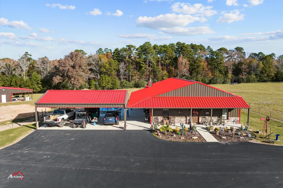 An East Texas dream home sitting on 16.150 acres. This immaculate 2600 square foot custom home has something for the entire family. Escape into your spacious primary bedroom with an oversized walk-in closet, beautiful bathroom boasting natural light over hand crafted sinks, makeup vanity, and a stunning textured shower door. The open concept kitchen is designed with every convenience in mind; from the gorgeous granite countertops to the walk in pantry and spacious custom cabinets, all of your kitchen needs are met with style. The living room has high ceilings and an impressive fireplace for those cold winter nights. Bring the whole family to the dinner table in the formal dining room while you enjoy a warm meal with a wonderful view of the property. As you continue down the hall, you will find a storage closet, guest bathroom with a shower tub combo, and three additional bedrooms. Once outside, the entertainment possibilities are endless. A porch that wraps around front to back of the home, as well as a swimming pool mostly surrounded by the new revolutionary composite decking. There is a half bath under the carport for guests while you entertain outdoors. The metal shop has a storage loft, one large bay door, and a RV parking space with a hook up and septic. The property has a natural spring, small pond, and is cross fenced to separate your