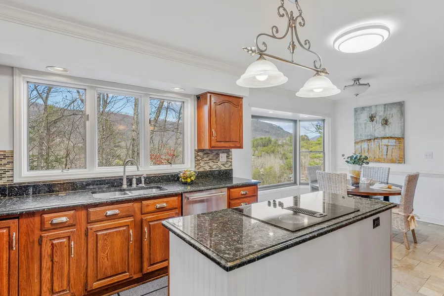 The gourmet kitchen is a chef's delight, boasting granite counters, stainless steel appliances, a warming drawer, ample cabinetry, and a charming breakfast nook with a large bay window. Host elegant dinners in the beautiful dining room, illuminated by decorative sconces and a picture window framing scenic mountain vistas.