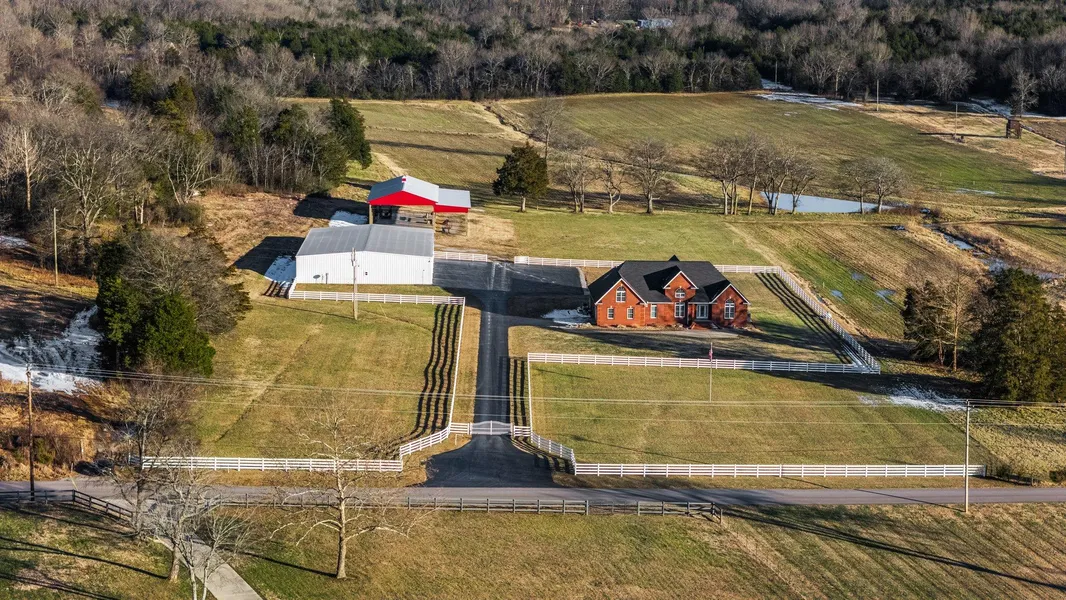 Amazing Mount Juliet Estate! 4456 square foot Contemporary style home on 83.76 level to rolling acres. Prime ground! The majority of the property has been row cropped in the past and has 6 additional lots, surveyed w/5 bedroom soils sites, ready to go for additional build sites. Perfect for a family compound. Located within minutes of Boat ramp on Percy Priest Lake, I-840 and Providence Market Place/Mount Juliet at I-40. Open floor plan, living room w/propane fireplace & adjoining gathering area. Downstairs Primary bedroom Suite w/Hickory Hardwood flooring, separate tub/shower & walk-in closets. Full Kitchen update in 2018 w/Quarts Counters & Copper faucets. Three spacious rooms upstairs including 20' x 22' bedroom w/full bath and huge double walk-in closets. Large covered concrete patio area in back w/propane fireplace & heat. 100' x 70 ' metal building w/steel frame construction, including Five, 12' tall by 14' wide garage doors, new epoxy flooring and 600 square foot of office space with full bath. 100' x 60" pole barn w/4,000 square feet of poured concrete. Paved driveway, gated entrance w/keypad access and enclosed with White Vinyl fencing. Whole house water filtration system, loaded with additional storage area, Nice privacy and views of abundant wildlife. House and property have been meticulously maintained.