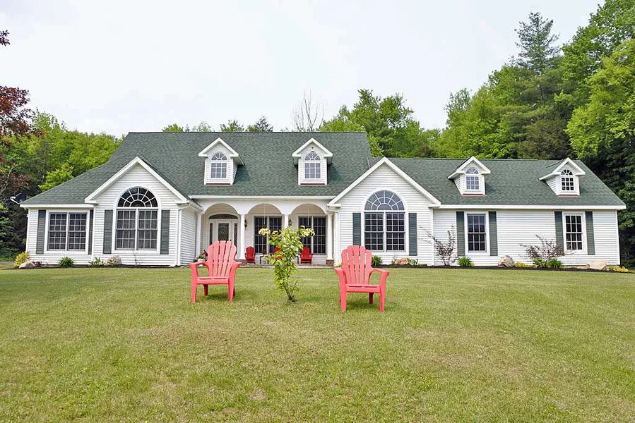 Impressive in design is this executive ranch that offers incredible architectural touches seldom found with one level homes. The first floor offers radiant heat, Brazilian cherry floors, incredible custom kitchen that opens into the living and dining rooms, cathedral ceilings, master bdrm suite, and brick fireplace with wood stove insert accented with beautiful palladian windows that take in the views of your covered patio. First floor laundry room, 3/4 bath, formal dining room, and two additional bedrooms compete the first floor. Above the garage you will also find a 15x29 bedroom and 3/4 bathroom that would be perfect for guests. The grounds are manicured with many floral delights and you even have your own private pond that is stocked with rainbow trout. The property is totally private, yet offering easy access, town water and offers some beautiful long range mountain vistas. Some other added benefits is the new roof in 2018 and boiler in 2019. The property not only has a two car attached garage but another detached 2 bay garage with attached shed located by your pond. The property also offers a couple other cute outbuildings as well. The location is perfect as it is an easy drive into Manchester and Rutland along with being convenient to numerous ski areas. A lot of property for the money.