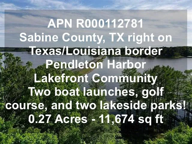 Gorgeous lot in Pendleton Harbor, a community situated along the Texas border of Toledo Bend Lake / Sabine River, near Hemphill with access to power and water for meter installation at the road. Sewer would be by septic. Low POA fees of just $150 per year. Site-built homes only, with a minimum of 800 sq ft. The subdivision offers property owners two boat launches, a 9 hole golf course, and two parks by the lake featuring a covered pavilion, restroom facilities, playground equipment, picnic areas, a boardwalk and a swim beach area. Designed for activit...